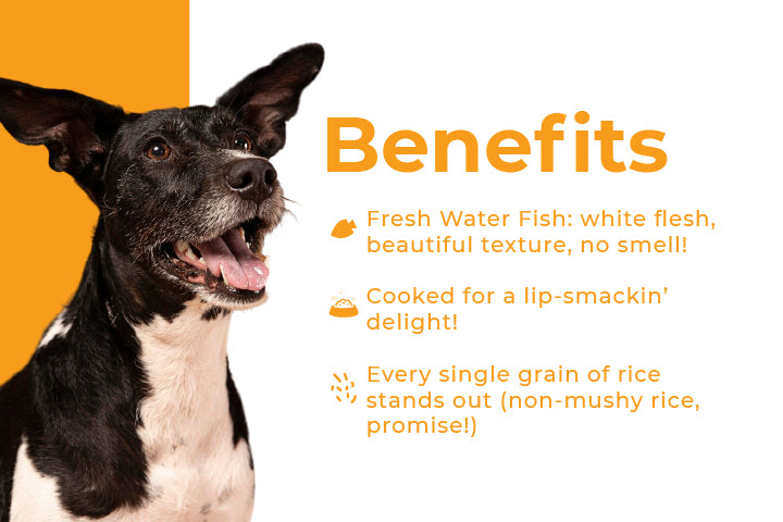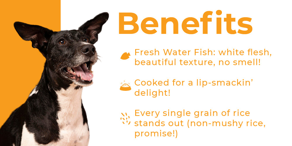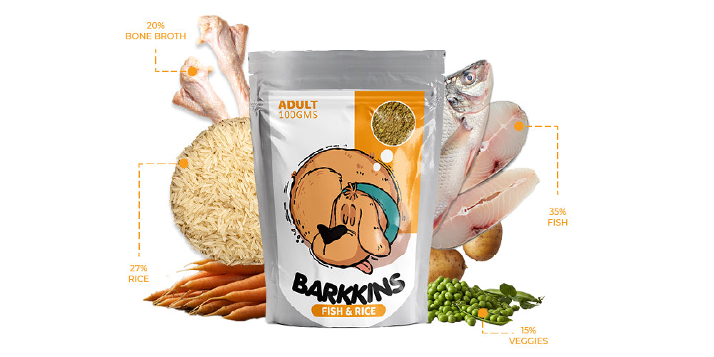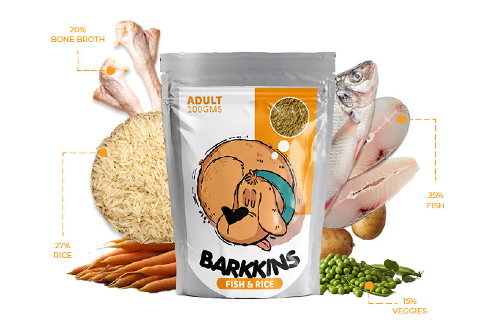 The Barkkins Fish & Rice (Adult) has 35% meat, 27% rice, 20% bone broth, and 15% veggies. It’s a powerhouse of real meat for your dog, where every single rice grain stands out!