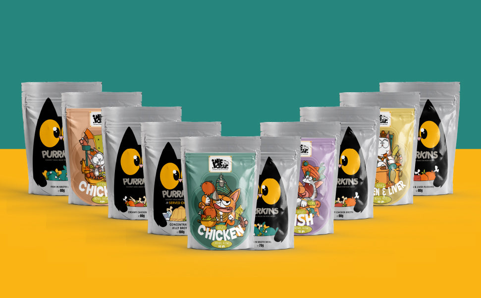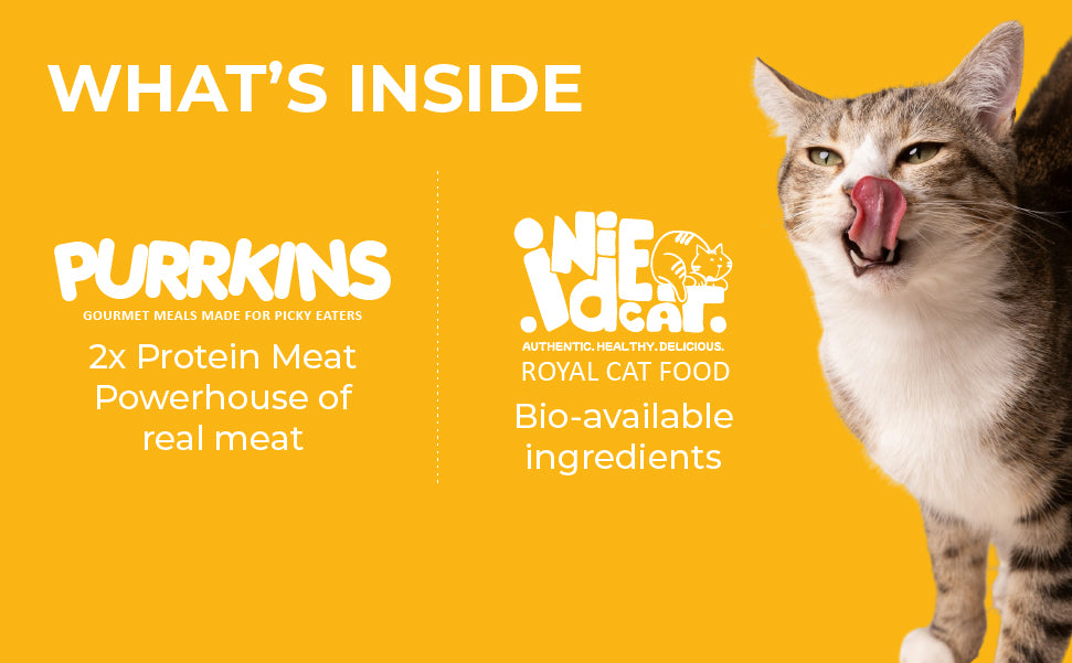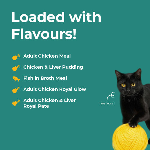 Why settle for less when your feline deserves it all? This thoughtfully curated variety pack features two gourmet recipes from our Royal Collection - Chicken & Liver Pâté Royal and Chicken Glow Royal - alongside three irresistible Purrkins flavours: Fish in Broth Meal, Chicken & Liver Pudding, and Adult Chicken Meal.