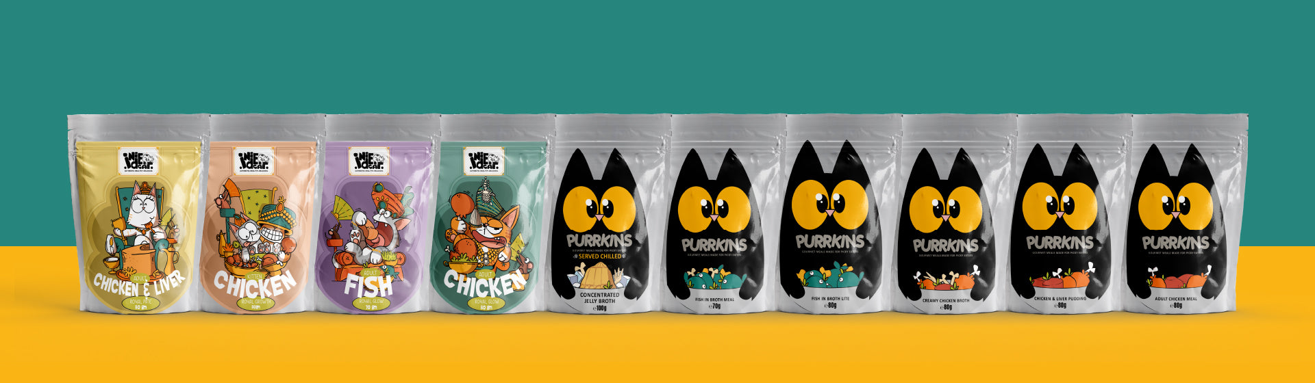 Two exquisite flavors from Indiecat Royal, paired with three delicious varieties of Purrkins.