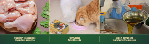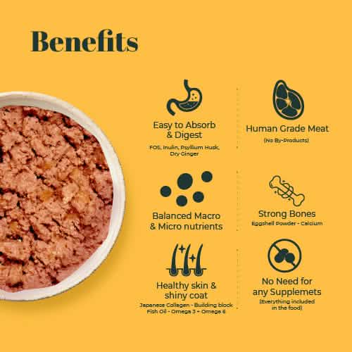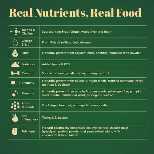 Chicken meat, Broth, Chicken liver, Chicken heart, Chicken fat, Fish oil, Collagen, Fortified nutritional yeast, Fructo-oligosaccharide, Yeast extract, Liver extract, Potato flakes, Inulin, Pumpkin seed powder, Psyllium husk, Beetroot powder, Moringa extract, Eggshell powder, Dry ginger, White pepper, Ashwagandha, Guar Gum, Iodised salt
