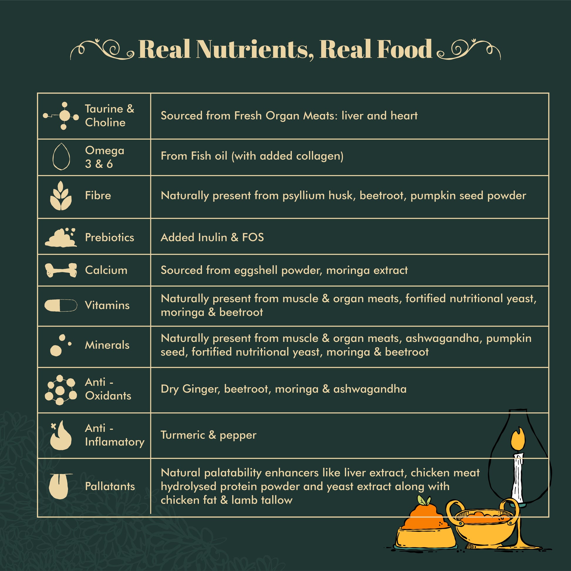 Chicken Fat, Collagen, Yeast Extract, Fortified Nutritional Yeast, Fructo-Oligosachharide, Pumpkin Seed