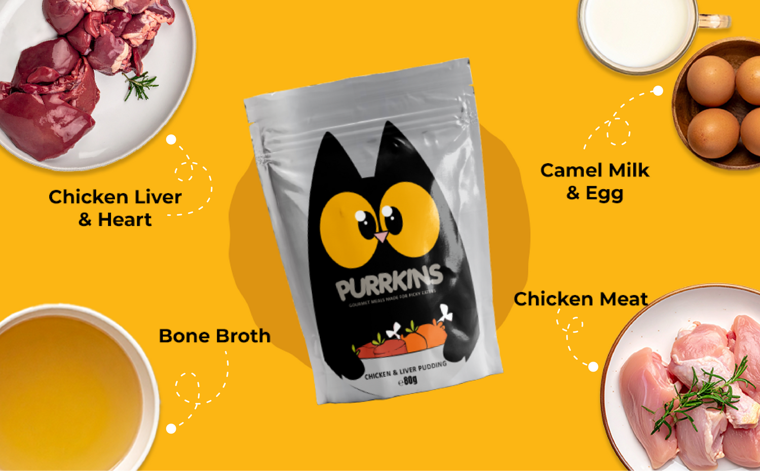 The Purrkins Chicken & Liver Pudding Meal has 75% meat, 10% camel milk, and 7% egg. That’s double the meat, double the protein, double the fat, and double the energy (phew!)