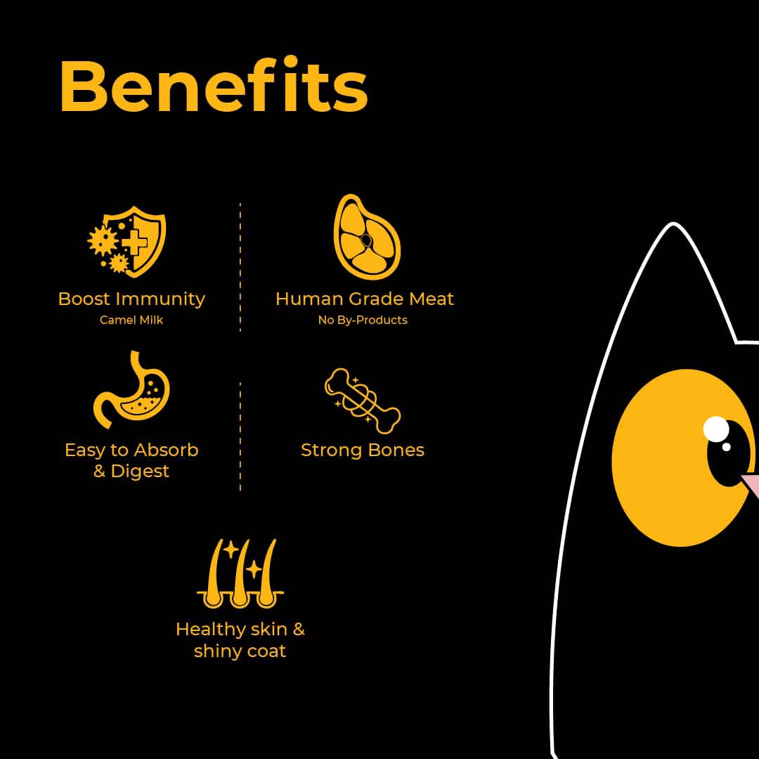 You’ll see your cat running around the house with double the energy! (oh, and the camel milk? It’s a booster shot of immunity!)