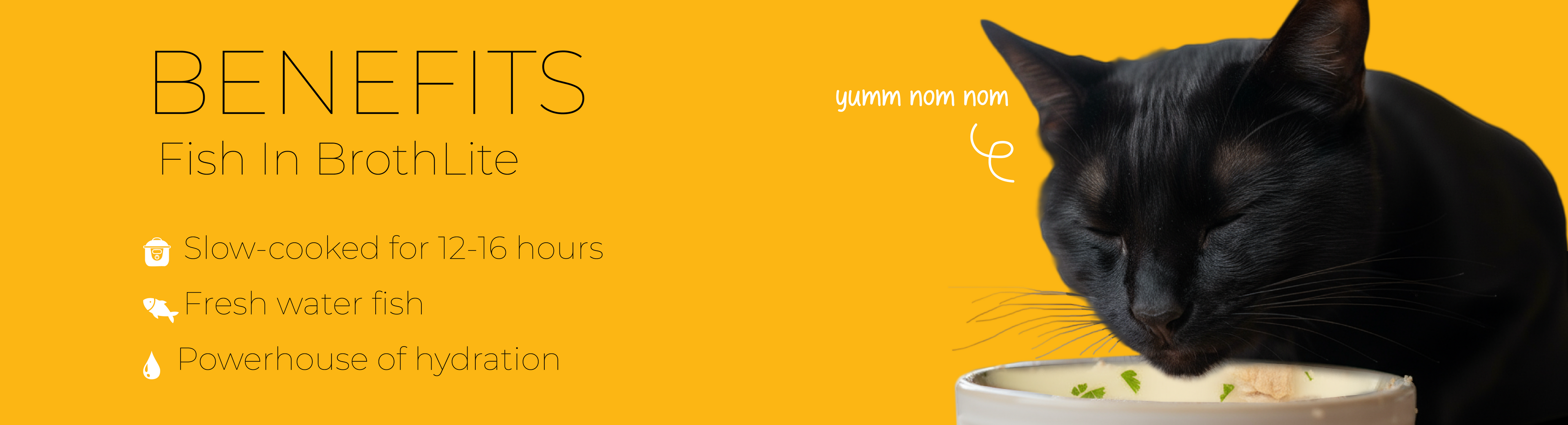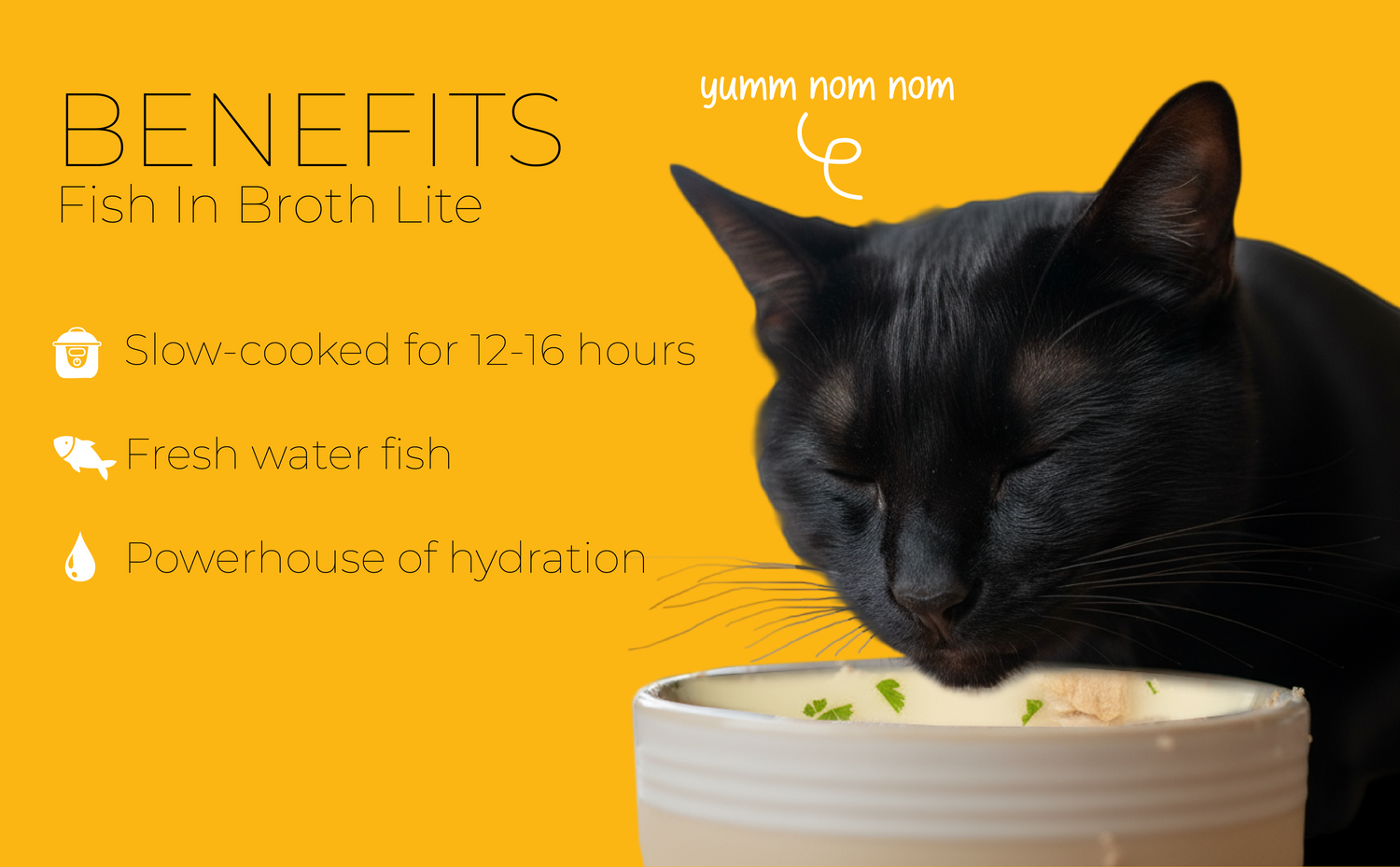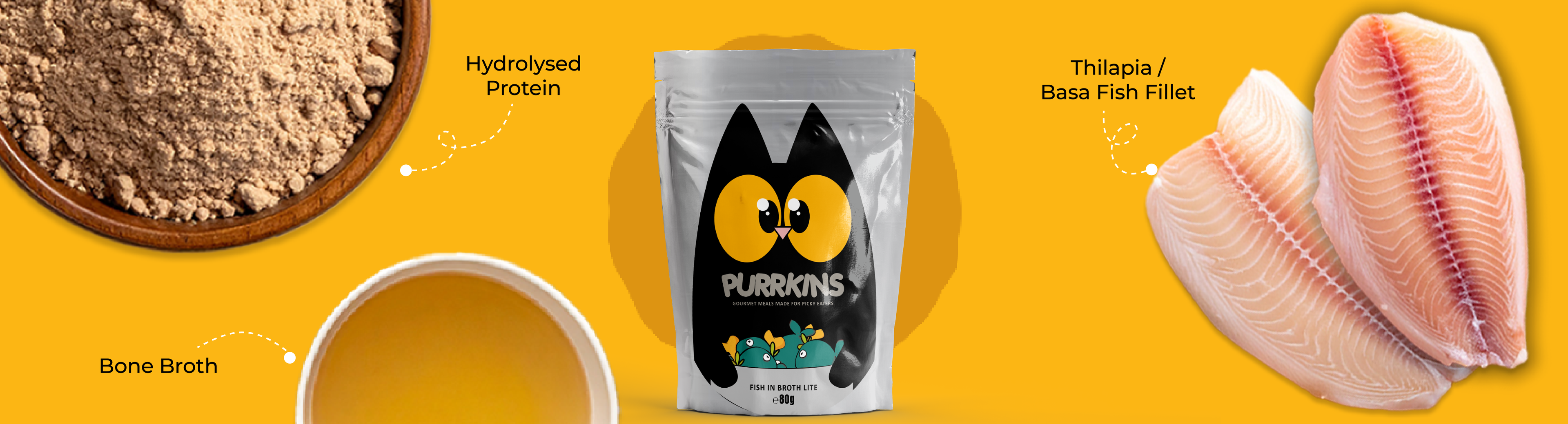 The Purrkins Fish in Broth Lite is cooked to perfection with fresh water fish - no colour to the meat, no smell of the ocean - just a lip-smackin’ bowl of health that is slow-cooked for 12-16 hours and acts as a super-source of hydration for your cat!
