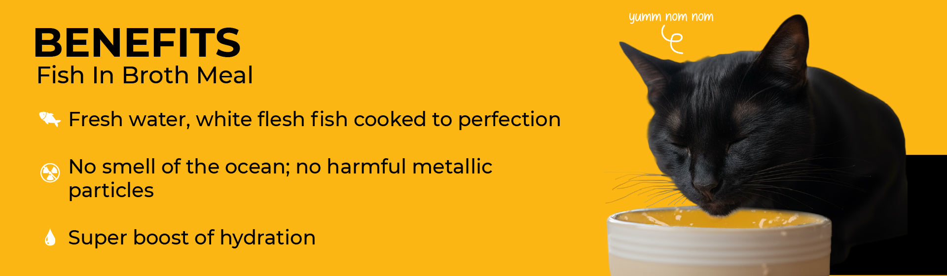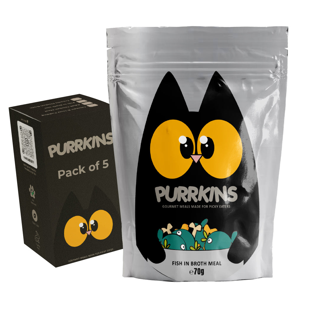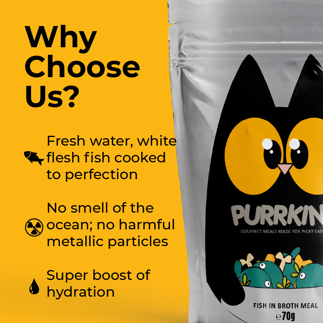 The Purrkins Fish Meal is cooked to perfection with fresh water fish - no colour to the meat, no smell of the ocean - just a lip-smackin’ bowl of health that is slow-cooked for 12-16 hours and acts as a super-source of hydration for your cat!