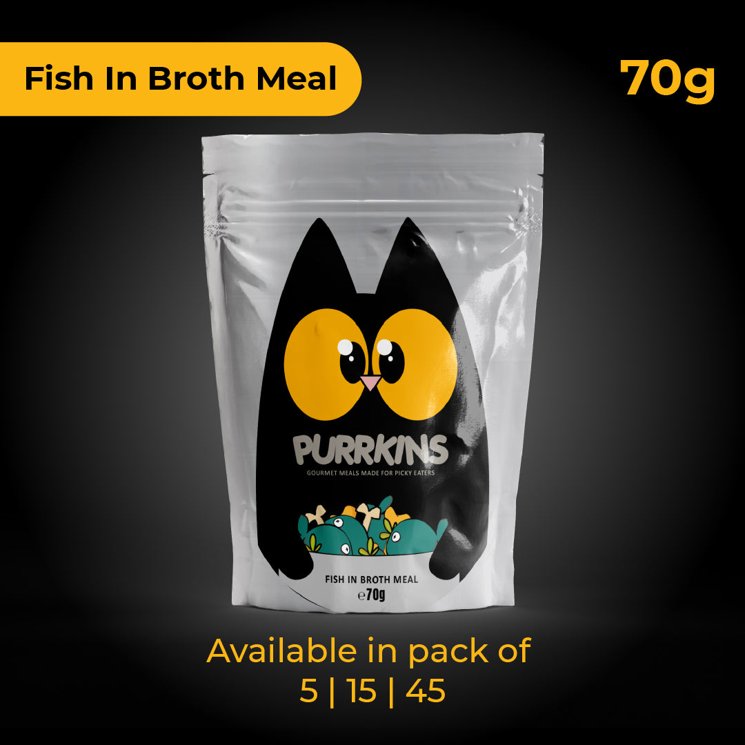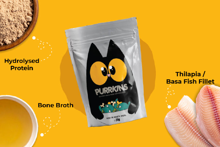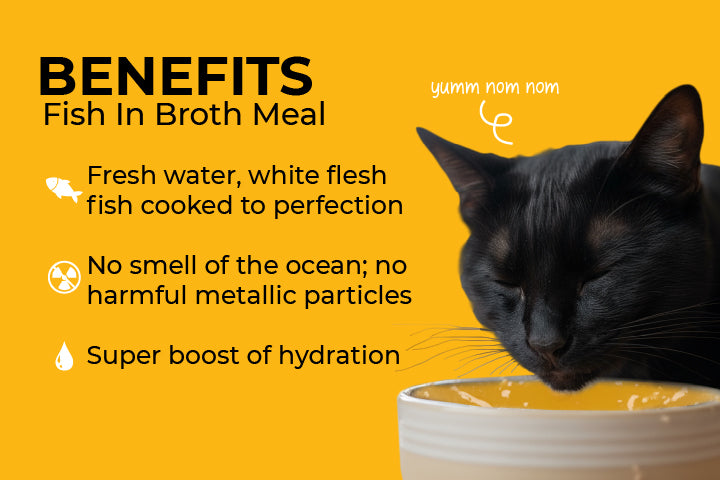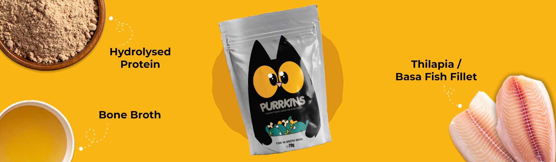 The Purrkins Fish Meal is cooked to perfection with fresh water fish - no colour to the meat, no smell of the ocean - just a lip-smackin’ bowl of health that is slow-cooked for 12-16 hours and acts as a super-source of hydration for your cat!