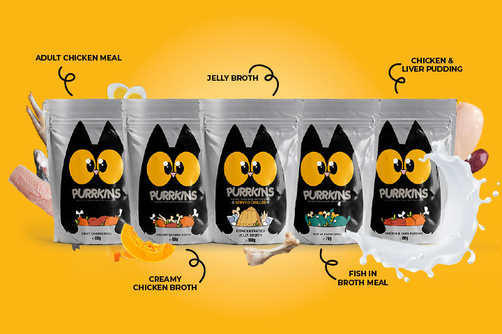 The Purrkins Fish in Broth Lite is specifically designed for these needs. It is the most ultra-light formula, containing just 79 kcal per 80g pouch. Its exceptionally high moisture content supports kidney function and urinary tract health.