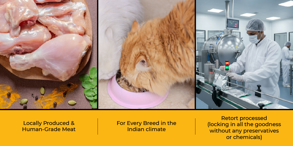Chicken meat , Chicken liver , Chicken heart , Bone broth , Camel milk , Eggs , Potato flakes , Ghee , Fortified nutritional yeast , Yeast extract , Vitamin & mineral blend , Turmeric powder , White pepper.