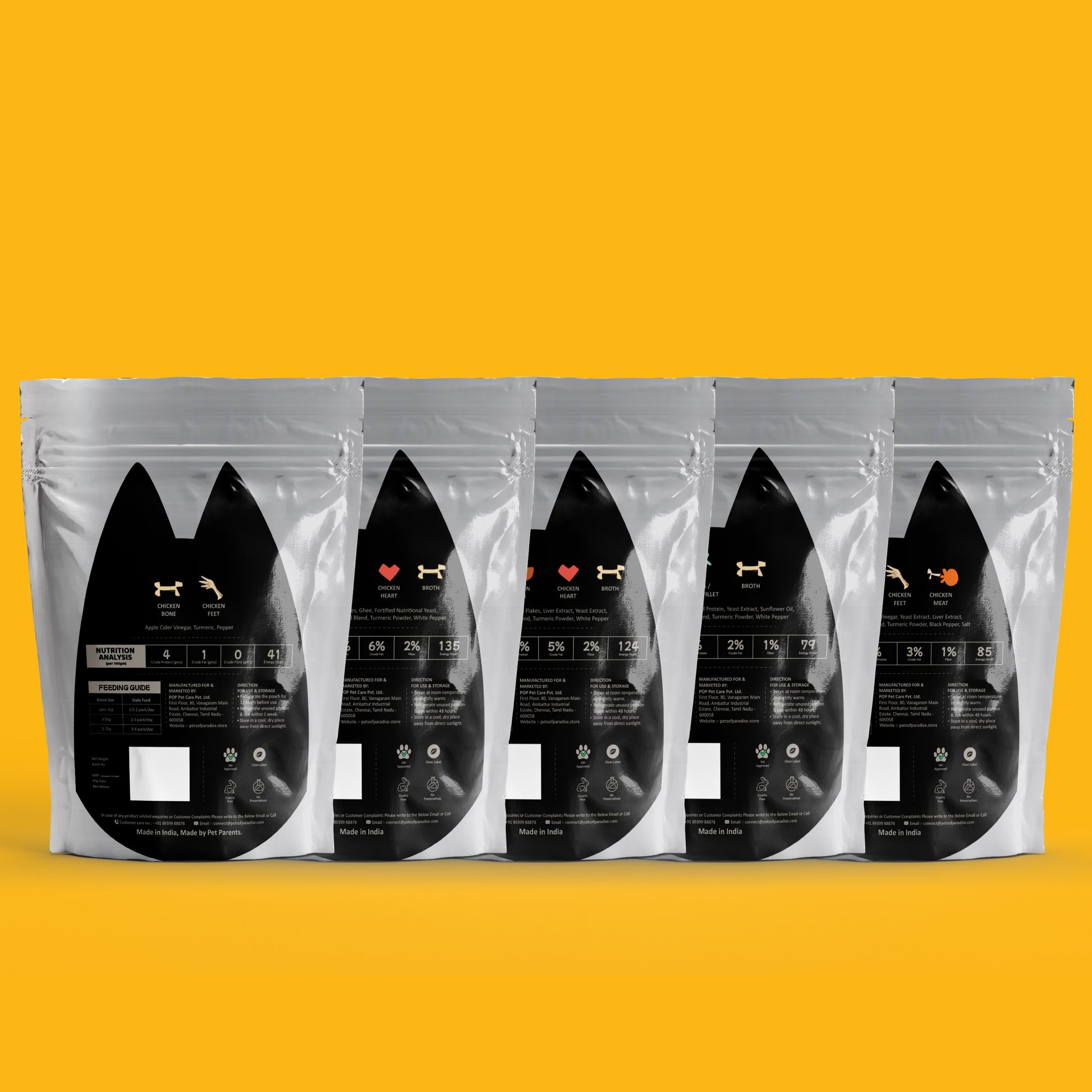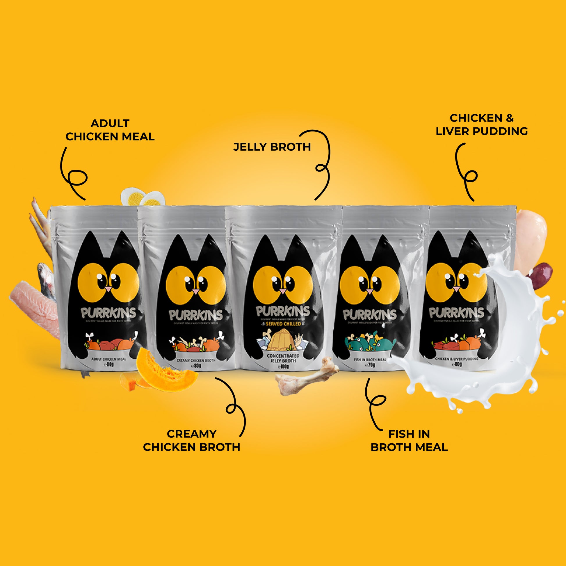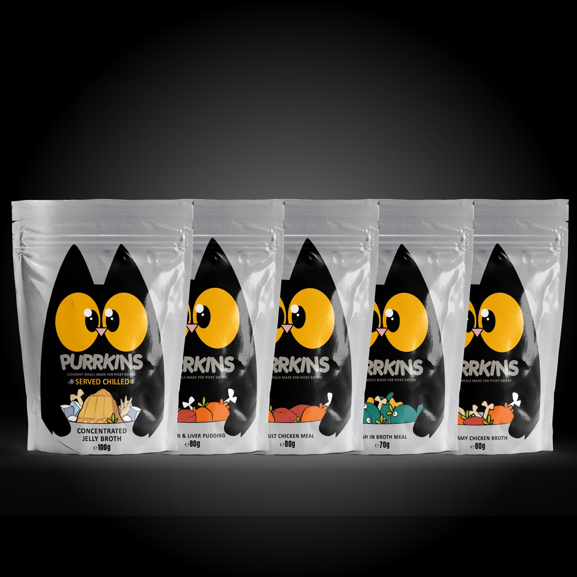 The ultimate starter kit for your feline to discover their new lifelong obsession. This pack contains one pouch of each of our five dangerously delicious meals: Adult Chicken Meal, Chicken & Liver Pudding, Fish in Broth Meal, Creamy Chicken Broth, and one unlisted flavour!